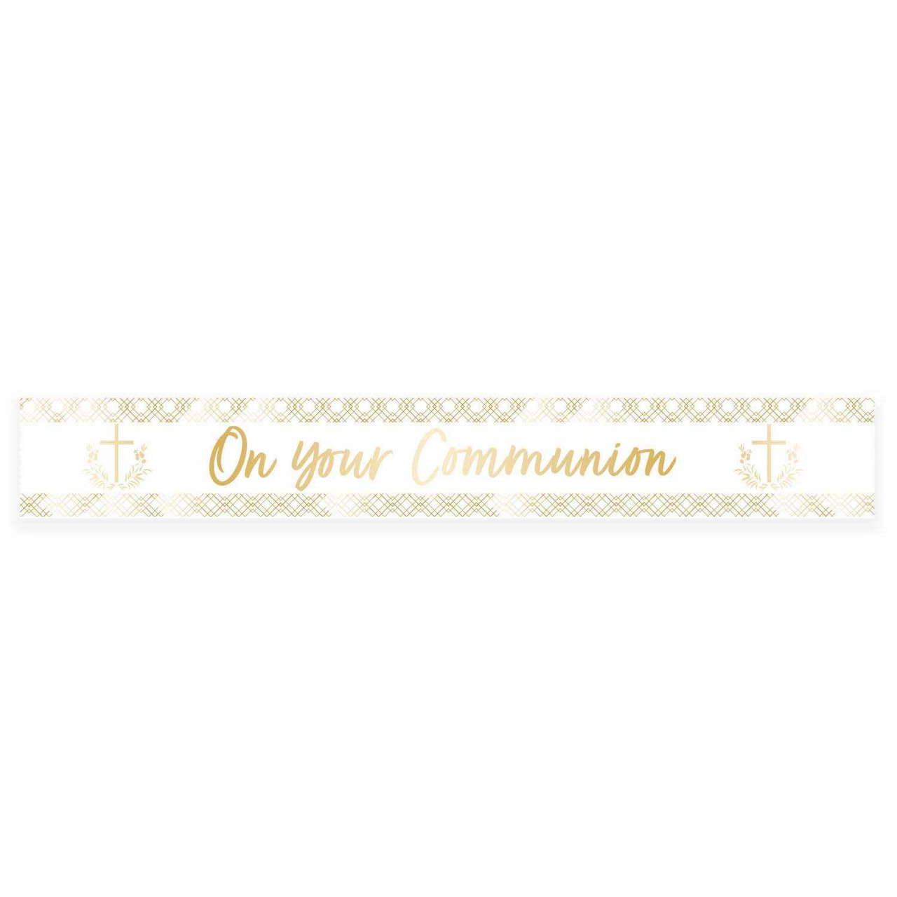 The banner features a gold and white banner with On Your Communion printed in gold lettering along with a gold design.